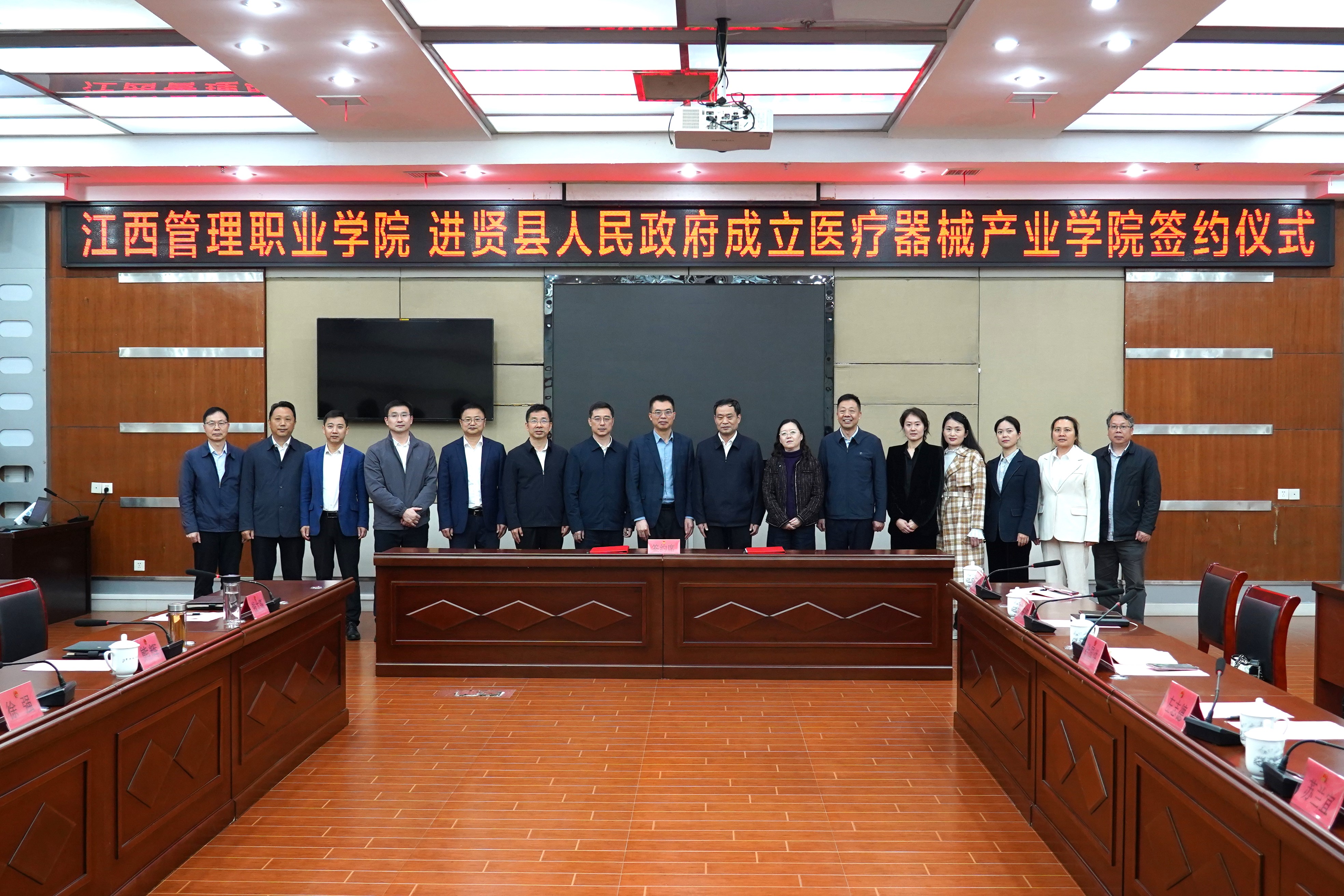 江西管理职业学院与进贤县人民政府将本着优势互补、资源共享、协同创新、共同发展、合作共赢的原则,共同建设江西管理职业学院医疗器械产业学院,构建融教育教学、技能培训、技术研发与成果转化为一体的现代化高水平高等职业院校。