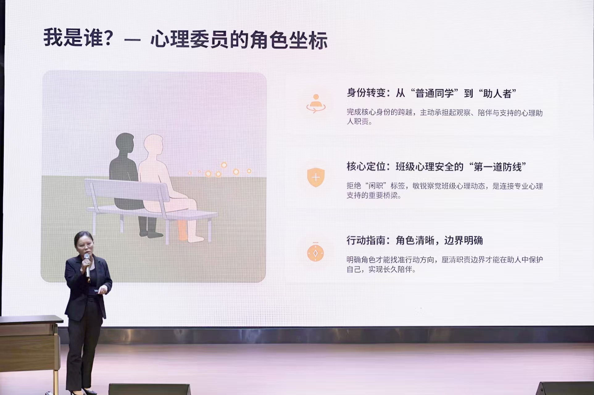 培训围绕心理委员的核心能力,分模块进行了系统讲解:明确班级心理委员的观察、倾听与陪伴定位,强化“助人者”身份意识,厘清能做与不能做的职责红线;传授了共情、倾听等实用心理技巧,帮助心理委员掌握与同学有效沟通的方法。培训还强调了危机应对的“生命至上”原则,系统梳理从辅导员、心理健康教育中心到专业医院的全链条支持资源,为心理委员履行“守护者”职责提供了清晰指引。整场培训内容扎实、互动频繁,有效提升了班级心理委员的职责认同与助人技能。