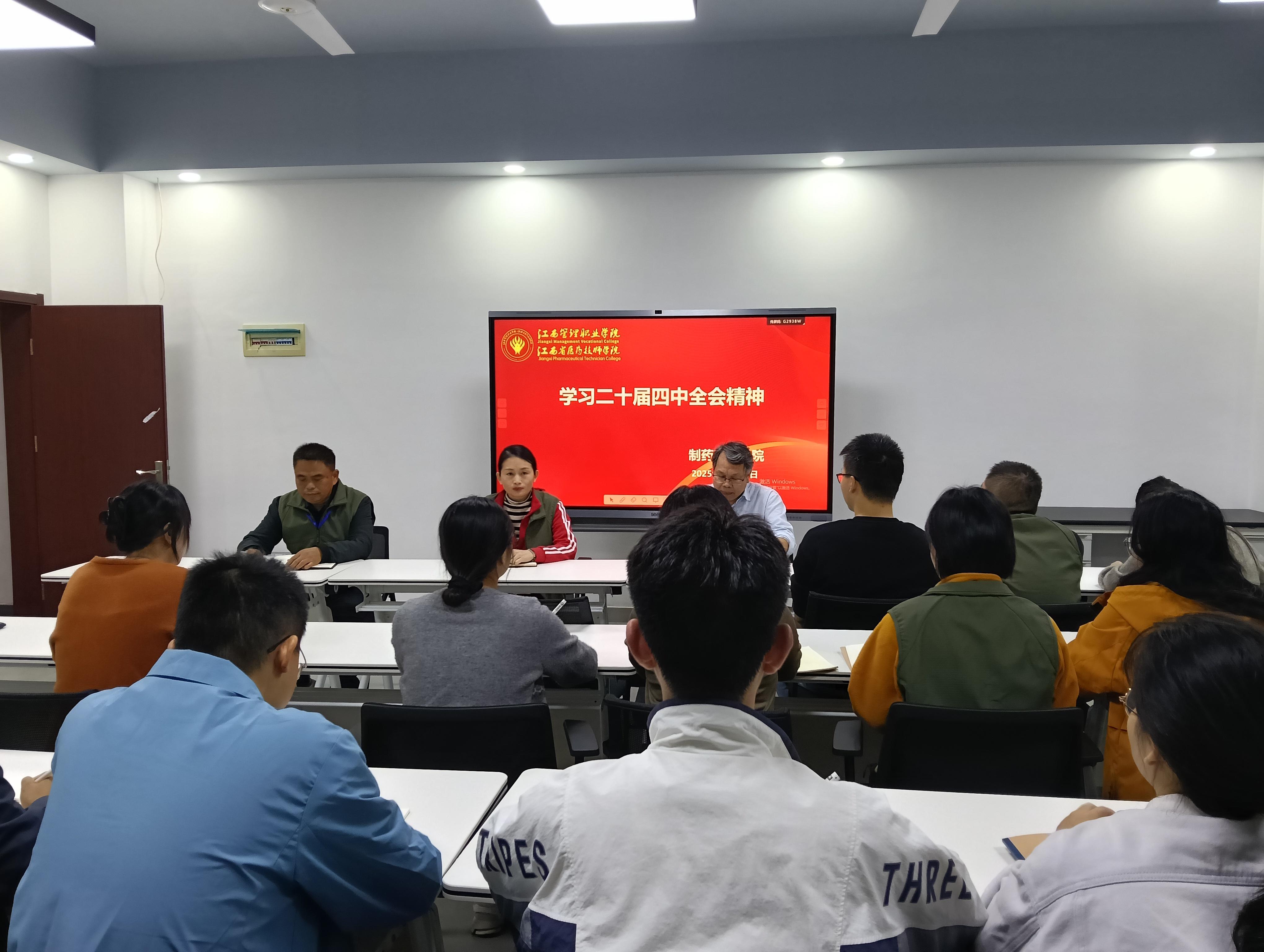 10 月 31 日,制药工程学院组织全体教职工集中学习党的二十届四中全会精神,院长江丽芸出席会议并作工作部署,副院长万华根主持会议。