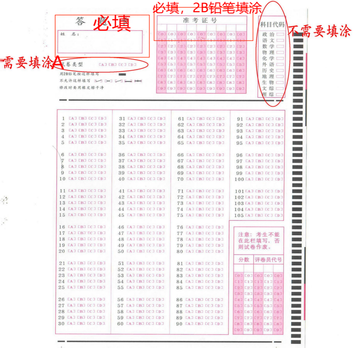 5. 答题卡填涂要求:选择题答案必须规范填涂在答题卡对应区域(答题卡填涂见下图:考试类型填涂A,科目代码不用填),翻译题必须书写在专用答题纸上。如出现书写不规范、填涂错误导致成绩无效,后果由考生自行承担。