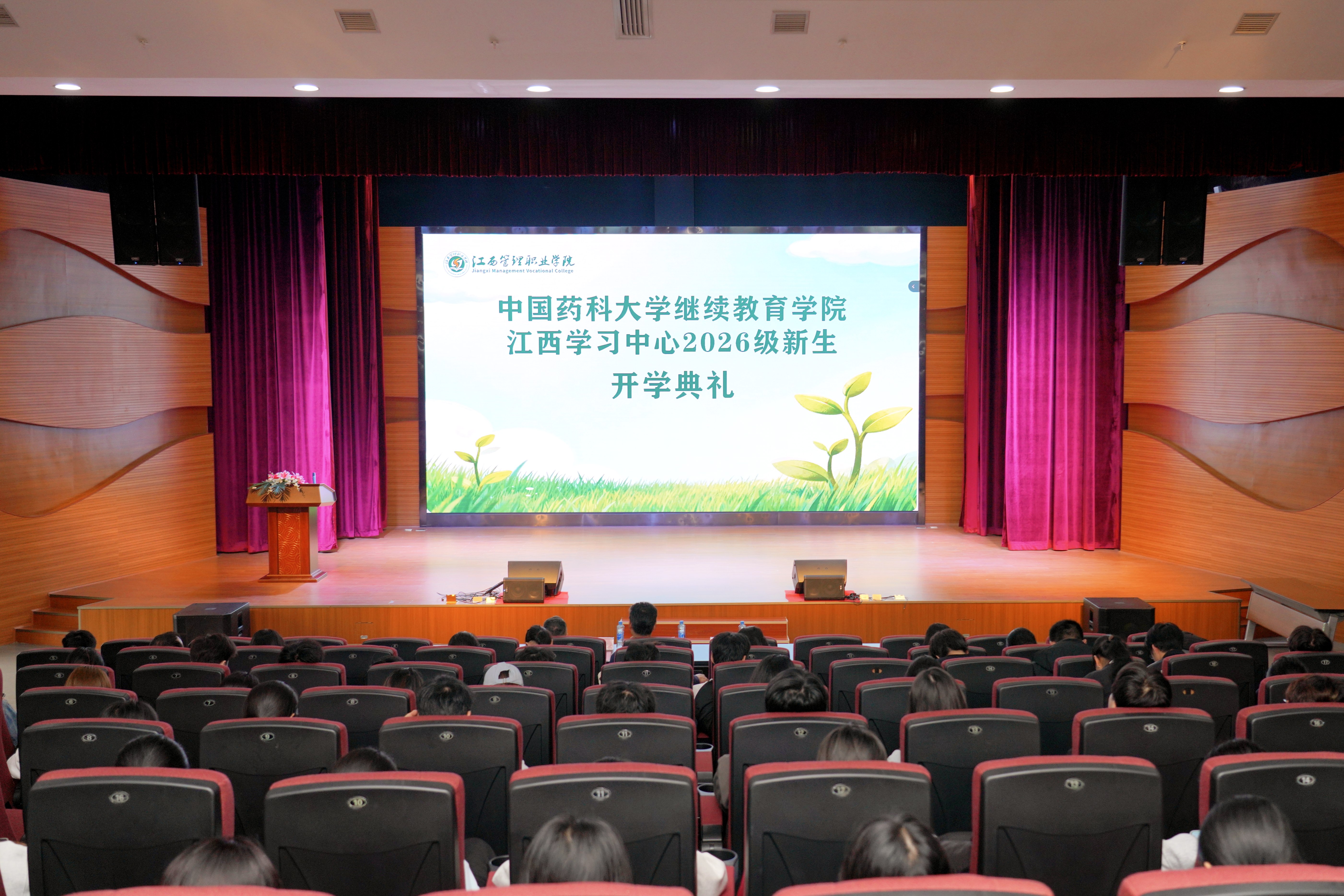 2026年4月11日,中国药科大学高等学历继续教育2026级新生开学典礼以“主会场+多分会场”形式举行,主会场设于中国药科大学玄武湖校区,江西学习中心分会场设在江西管理职业学院翠林校区。江西管理职业学院党委委员、副院长吴群峰出席,继续教育与培训学院副院长胡燕红主持,2026级新生及江西管理职业学院24级学生骨干参会。